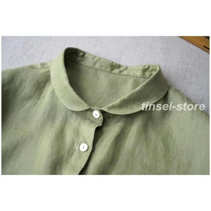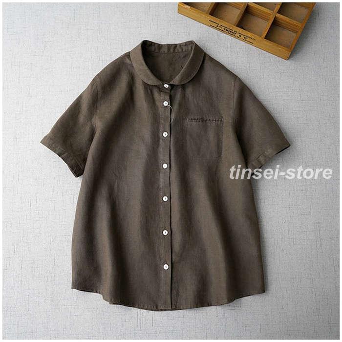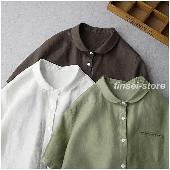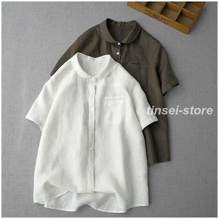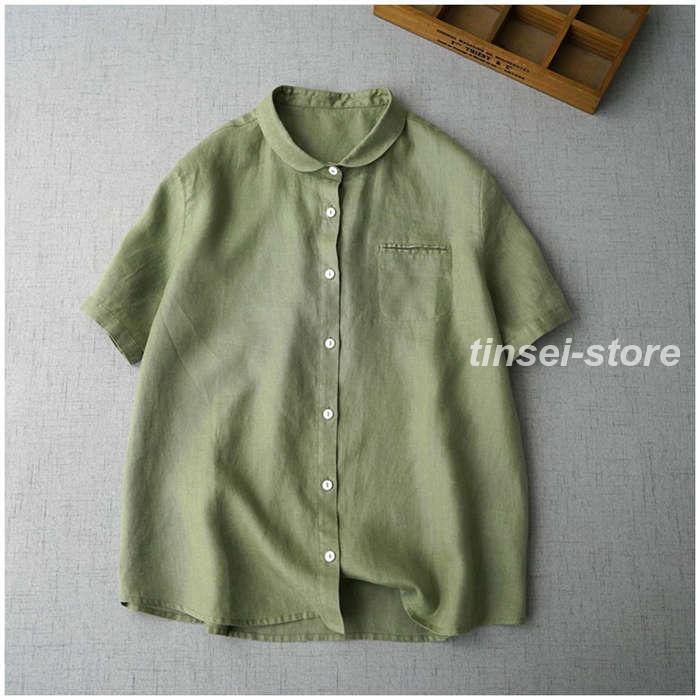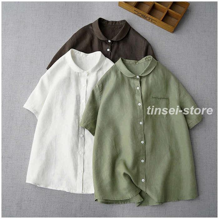 [] シャツ レディース 夏 半袖 ブラウス 綿麻風 丸襟 薄手 トップス 前開き きれいめ お洒落 大人 可愛い シンプル カジュアル 無地 オフィス フォー