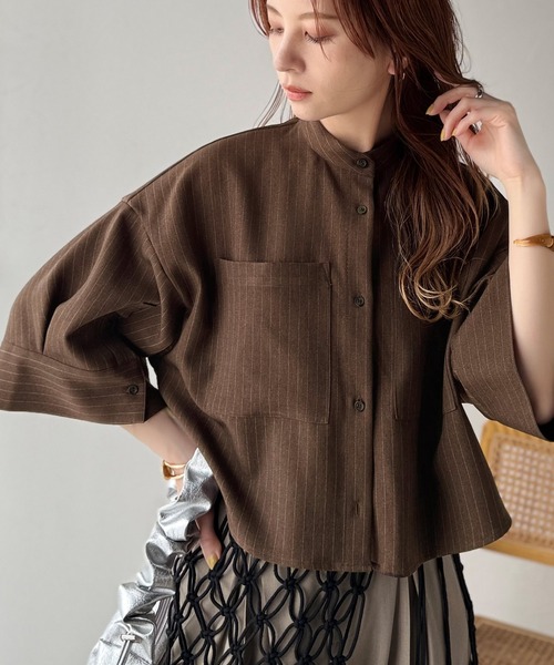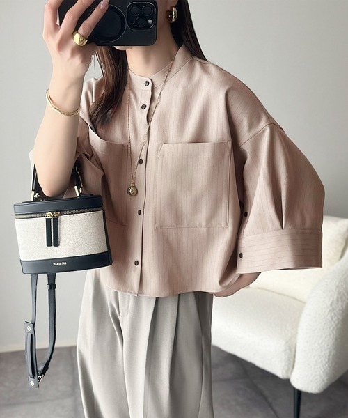 キーワード:ブラウス シャツ レディース スタンドカラー ストライプ ワンポイント 七分袖 五分袖 WEB限定 オケージョン オフィスカジュアル キレイめ デート マニッシュ 春 定番 旅行