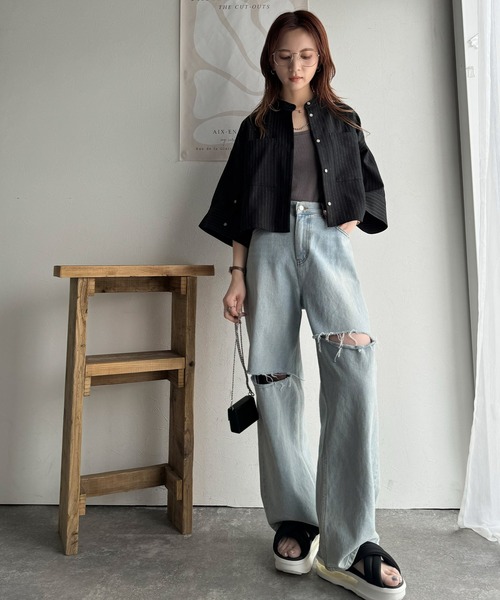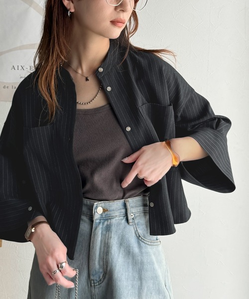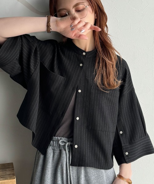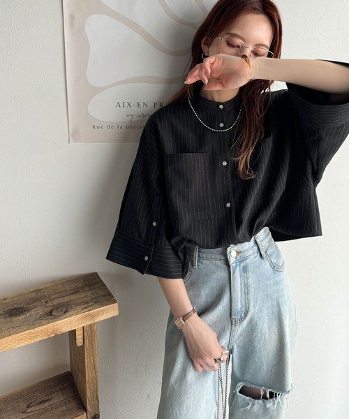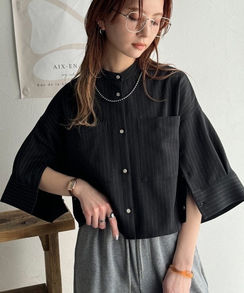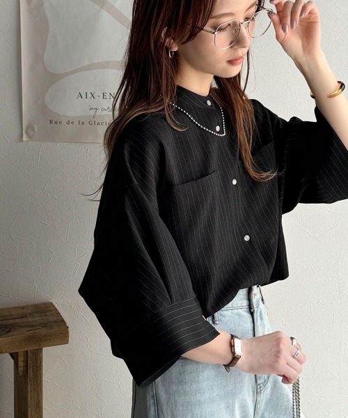 classicalelf ブラウス シャツ 大人の上品トップス。バンドカラーワイドスリーブショート丈ストライプシャツ(半袖) レディース
